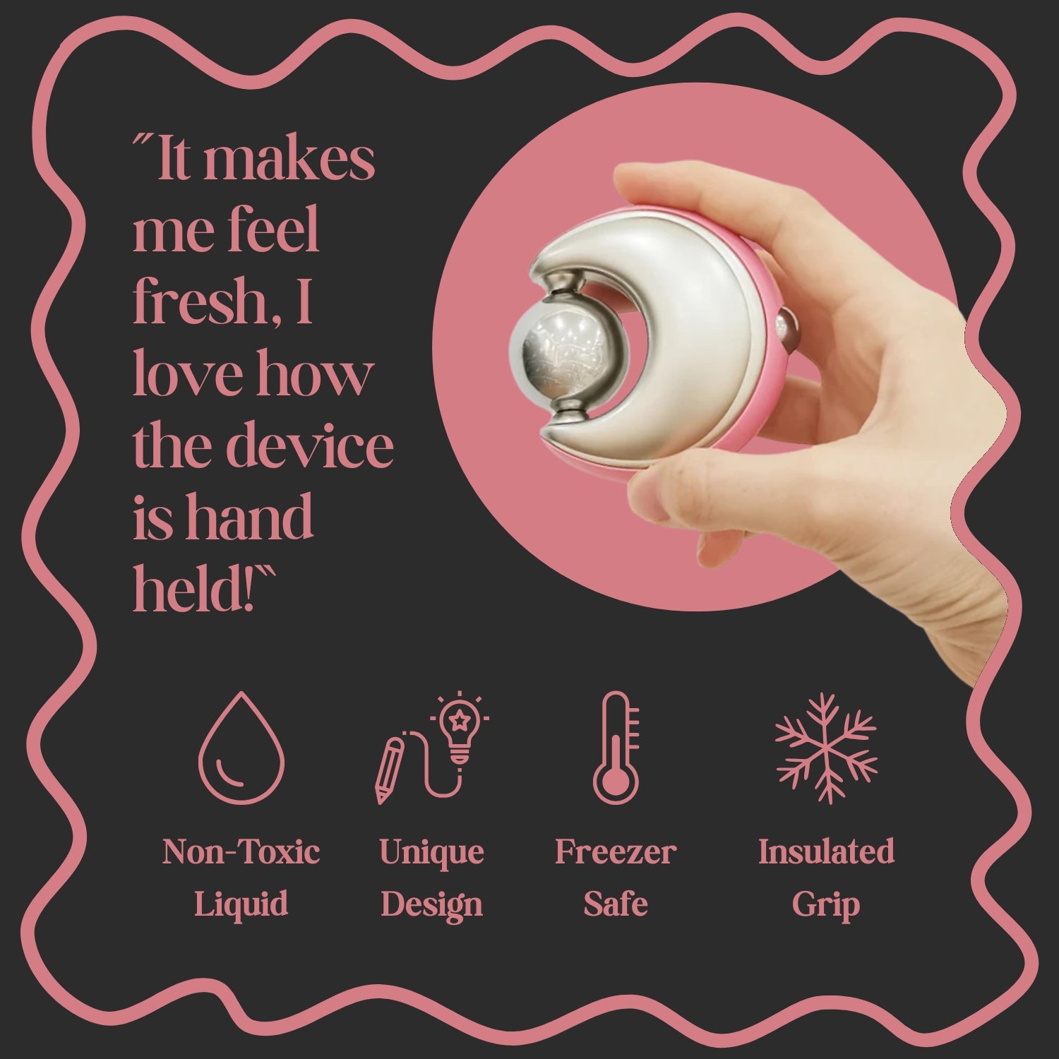 Premium stainless steel stays cold (or warm) for up to an hour of soothing therapy.